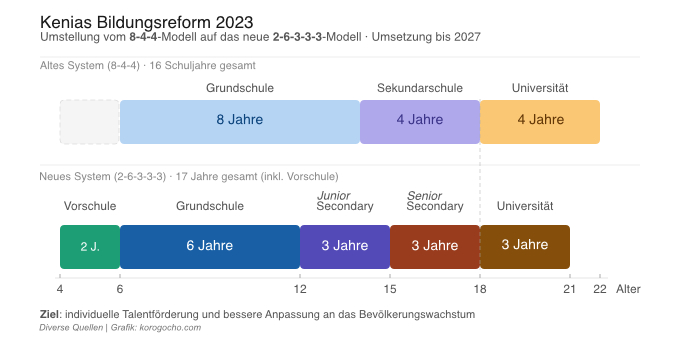 Bildungsreform in Kenia: Das Schulsystem durchläuft die größte Reform seit Jahrzehnten. Das bisherige 8-4-4-Modell wird durch ein flexibleres 2-6-3-3-3-System ersetzt — mit mehr Übergängen, früherem Schuleintritt und kürzeren Studiengängen. Was steckt dahinter?
